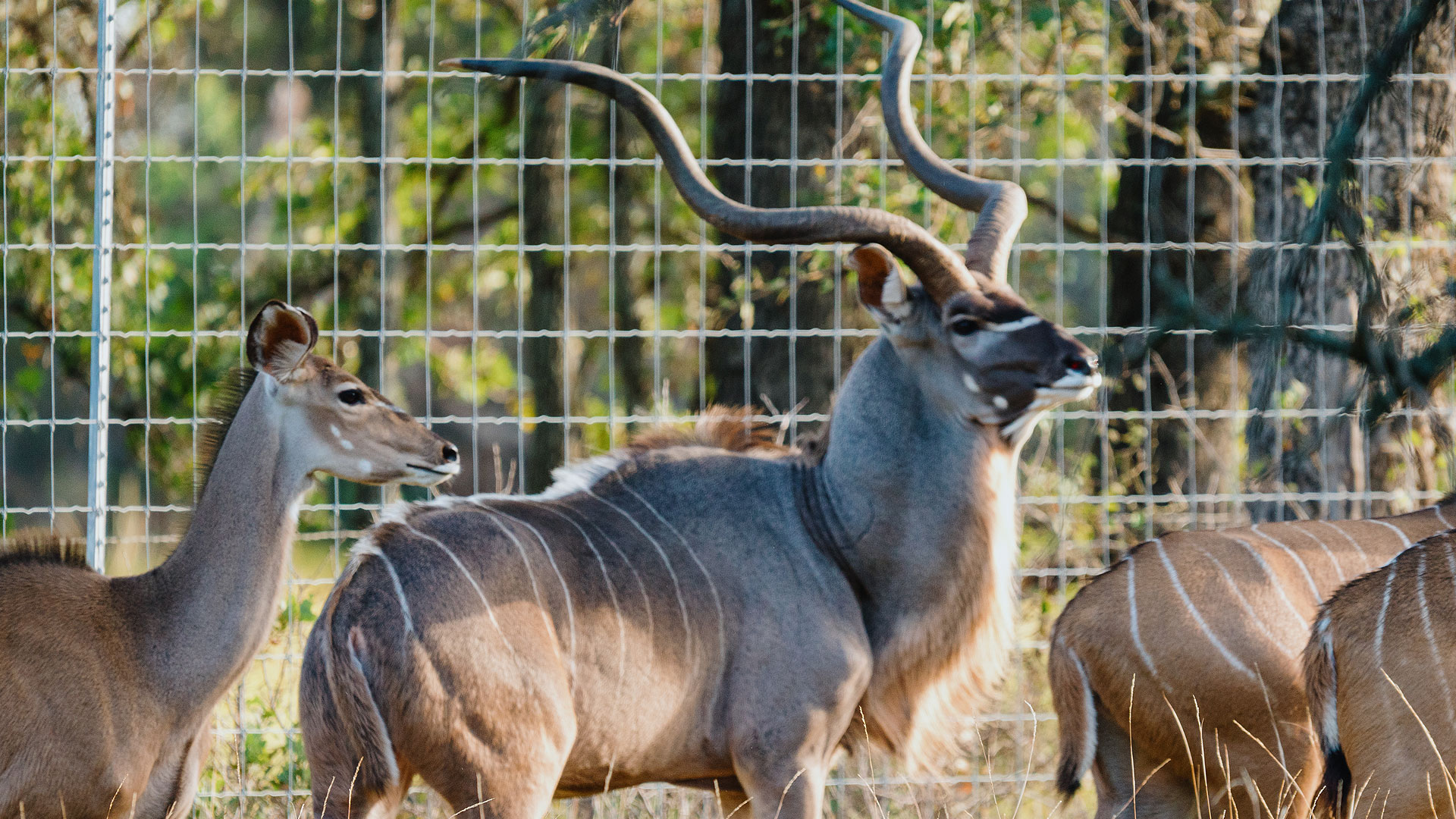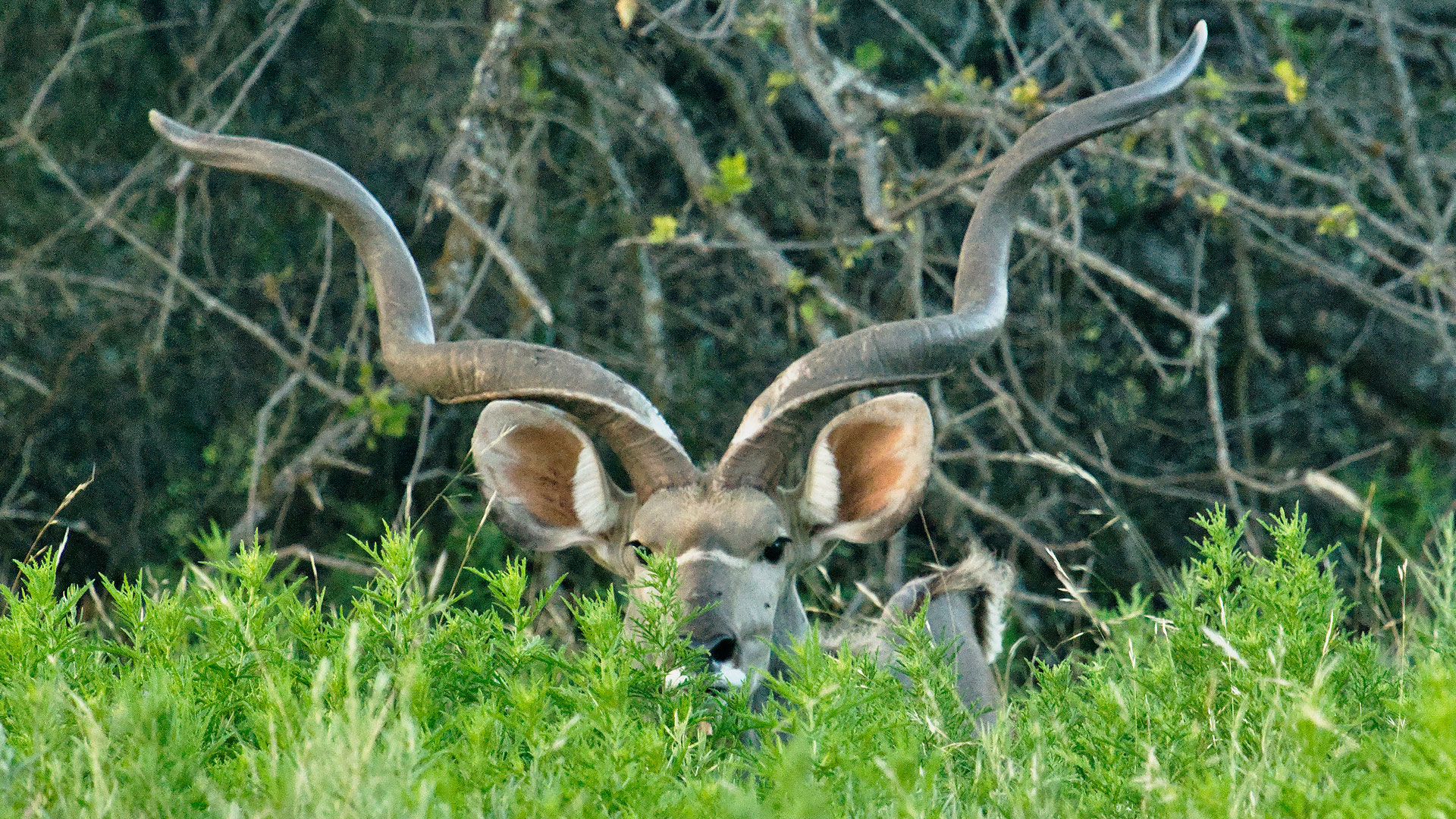 This is one of the largest species of antelope. Kudu bulls weigh 420 to 600 lbs, and stand up to 5’ tall at the shoulder. The ears of the Greater Kudu are large and round. Cows weigh 260 to 460 lbs and stand 4ft tall at the shoulder; they are hornless, without a beard or nose markings. The head-and-body length is 6ft to 8ft. The bulls also have beards running along their throats, and large horns with two and a half twists, which, measures around the curls, average length of 50”, with the record being 75 2/8”.